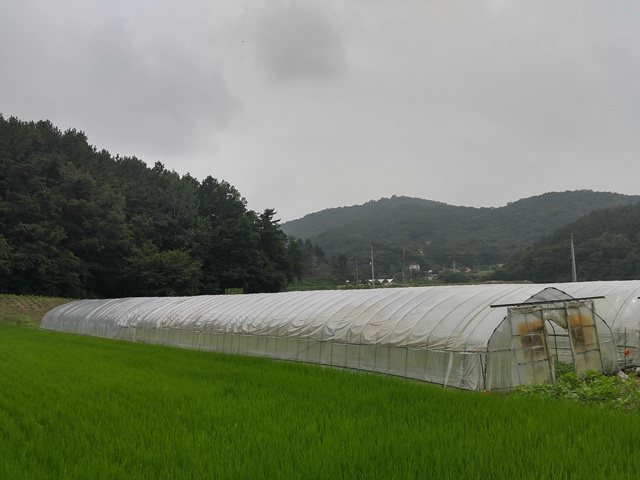 도로보다 약간 낮으며 비닐하우스 4동이 있습니다.