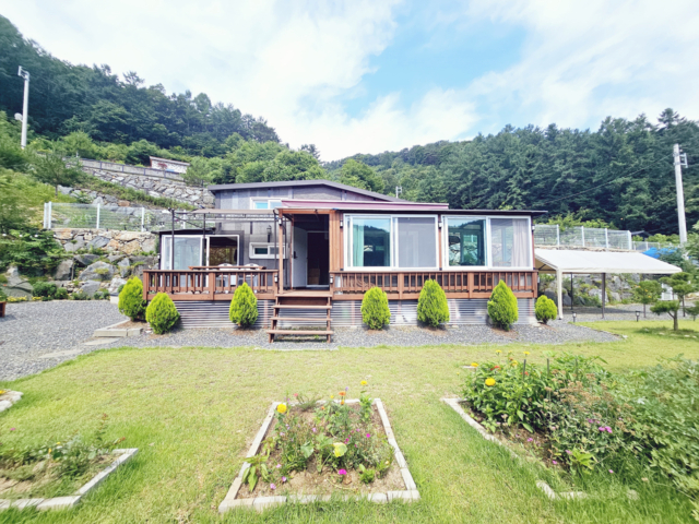 | 동향, 대227㎡(68.67평), 전357㎡(107.99평), 도로지분46㎡(13.92평), 개별지하수, 정화조 - 2020년 준공완료된 경량철골구조 제2종근린생활시설 - 1층 : 연면적12.89평, 거실 겸 방1, 주방2, 욕실1, 다락방1, 테라스, 주말 주택으로 사용중 국유지 임야가 접해있어 보리수나무 등을 심어 놓으심. (국유지 임야 대략 70~80평정도 무료로 사용하신다고 함.) 주택을 경계로 마당은 비포장이며, 잔디와 자갈이 깔려있음. 주택의 입구 텃밭이 있으며, 포도나무, 상추, 토마토 등 심어져 있음 데크설치 및 야외싱크대 다용도실이 있으며, 거실창측은 증축하여 난로 설치 및 별도의 테라스 공간으로 사용. |