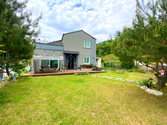 남서향, 대416㎡(125.84평), 2021년 준공 목구조, 0/2층 구조, 2종근생(사무소) 35.7평 1층: 방1, 거실, 주방, 욕실1, 다용도실1, 2층: 방2, 욕실1, 외부테라스 ,개별지하수, 정화조, LPG가스보일러 잔디마당, 디딤석, 자갈포장, 철제울타리, 외부창고(2.7평) ,조경수, 조경석, 데크, 텃밭