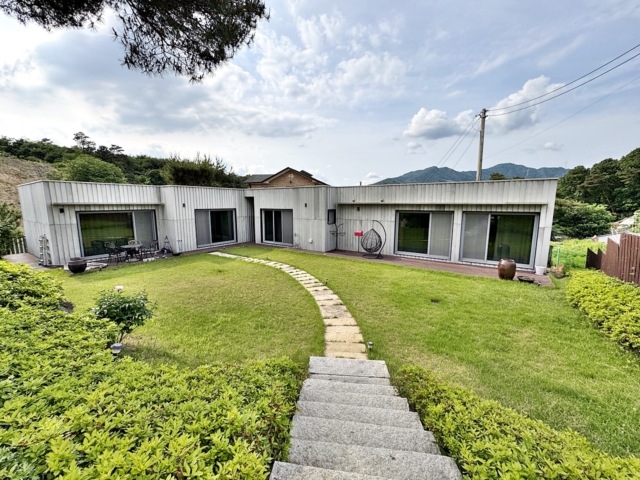 남향, 대739㎡(223.55평), 2024년 준공, 철근콘크리트, 주택 43.52평, 지하수, 오수관로, 보조주방, 바베큐장 드레스룸, 시스템에어컨, 평데크​ ,방3개, 거실, 주방, 욕실3개, 큰소나무 3그루, 텃밭, 경계 화단식조경