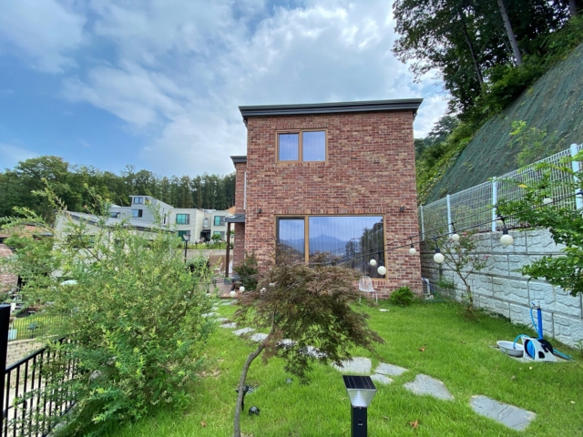 잔디마당, 디딤석, 조경수, 철제휀스 ,데크 하단부 주차 후 계단으로 진입하는 구조, 2023년 준공 목구조,