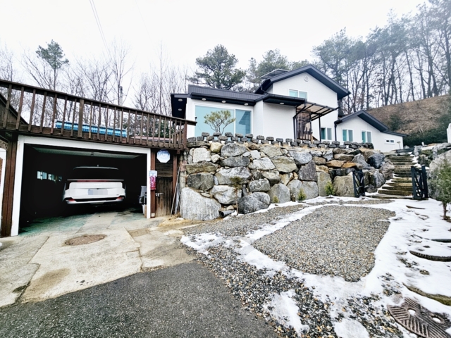 남향, 대709㎡(214.47평), 단지내 최상단에 위치한 주택으로 시원한 전망 나옴 목조주택, 0/2층 구조, 1층 44.63평, 2층 20.42평, 공동지하수, 정화조, 창고, 계단밑창고 보조주방 및 다용도실​, 1층​ 방5개 (작은방 3개 포함), 거실, 주방, 욕실2개, 벽난로, 거실시스템에어컨 2층 방3개 (큰방 1개를 거실로 사용중), 욕실1개, 방2곳 벽걸이에어컨, 22년도 전체 리모델링 증축함 2단 지형, 차고, 야외주차, 경계석축토목, 넓은 정자, 소나무 및 잔디 기본조경. 차고위 넓은 야외데크