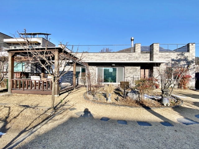 | 남향, 대446㎡(134.92평), 도로지분50㎡(15.13평) - 2017년 준공 철콘조, 0/1층 구조, 주택 31평 벽난로(거실)/ 상수도/ 정화조/ 태양광, 방2, 거실, 주방, 욕실1, 다용도실1, 붙박이장 - 데크, 잔디마당, 디딤석, 조경수, 유실수, 경계조경, 텃밭, 가제보 |