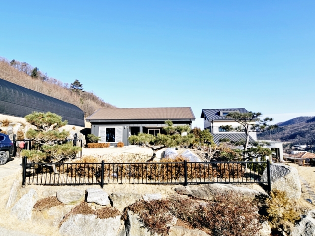 남향, 대529㎡(160평), 도로지분85.92㎡(26평) - 평탄지 남향이며 남향으로 채광 있음 - 주택 32평 ( 지붕시공된  오픈된 공간 포함, 실내 전용평수 약 22평), 2채 공동지하수, 정화조 다용도실 겸 세탁실, 컨테이터창고, 방2개, 거실, 주방, 욕실1개, - 경계 철재울타리, 경계석축공사, 평탄지 잔디, 텃밭, 소나무 및 정원수 경계, 디딤석, 야외주차