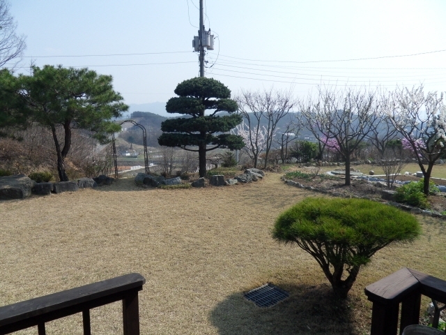 석축, 넓은 잔디 마당과 소나무, 텃밭 등 멋진 정원과