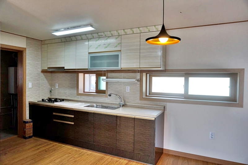 2층 거실 한쪽에 보조주방 설치되어 있음, 2층 외부테라스와 1층 주택 측면에 비가림 지붕 설치됨