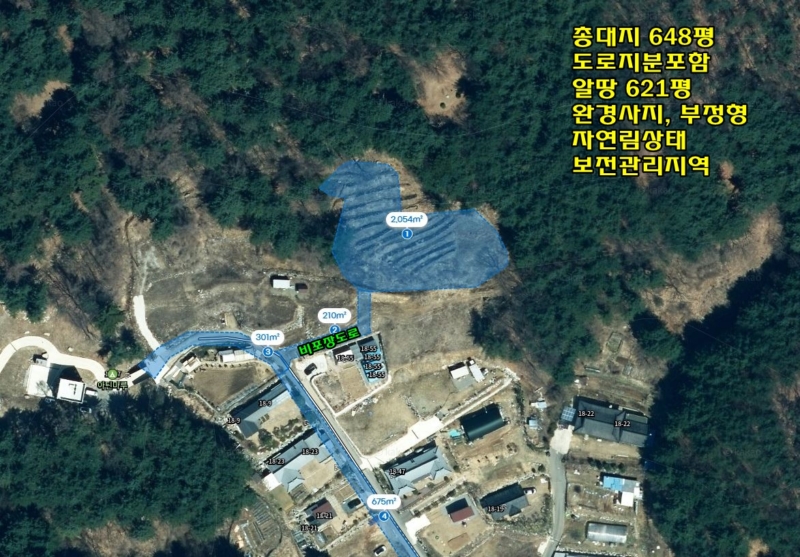 | 간략설명 | 남향, 답2054㎡(621.34평), 도로지분89.6㎡(27.1평), 완경사지/밭으로 사용중, 버스/2차선도로 400m, 편의시설 4.2km |