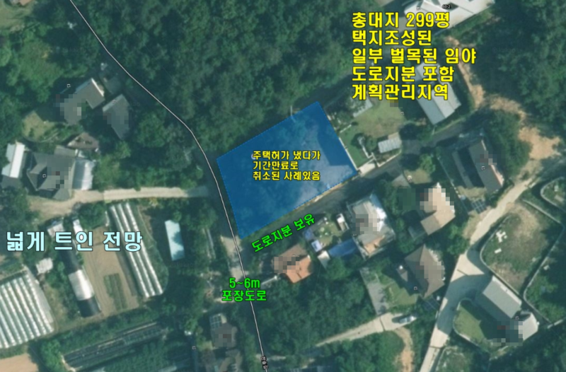 5~6미터 현황도로, 남서향의 전망좋은 위치, 전용275평+도로40평, 2단지형, 석축토목완료, 계획관리지역