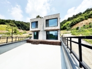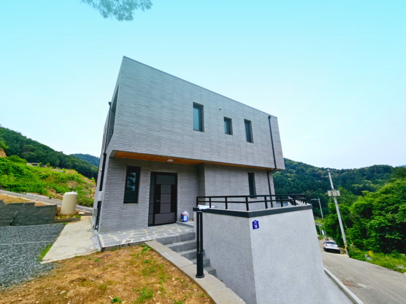 도장리 전원주택지 개발단지 초입에 위치한 주택으로,진입로는 경사가 지어져 있음.