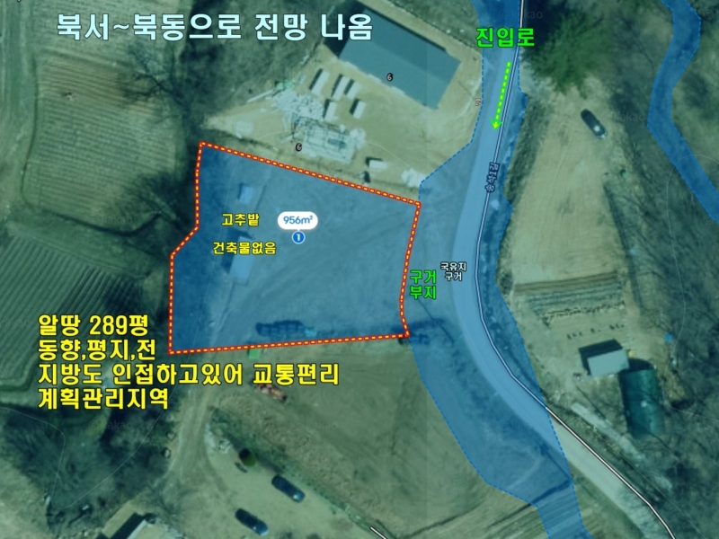 간략설명 | 남향 및 동향 건축가능하며,전망은 북서~북동으로 나옴 계획관리지역, 평탄지에가까운 완경사지,밭으로 사용중, 일부 고추밭 도로접한부분 구거부지여서 서비스 야외주차공간있음,4m 포장도로, 구거 국유지, 현황도로 지방도 100m, 버스정류장 296m,동양평 톨게이트 2.5km, 양동면 생활권 4.1km 양동역 경의중앙선 4.2km |