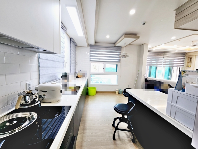 거실 아트월, 벽장수납공간이 있음.,주방에 아일랜드식탁, 다용도실, 붙박이장, 3구 인덕션