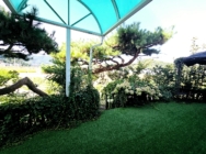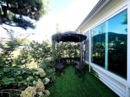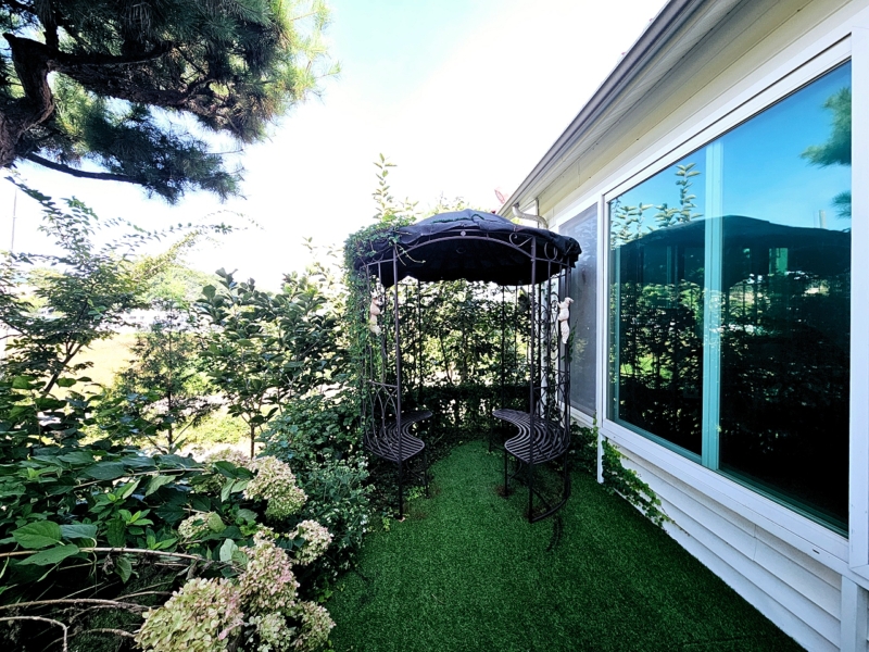 데크공간 썬룸 시공되어 있음, 넓은 주차공간-화단식 정원조경, 구석구석 포인트 조경이 잘되어 있는 조경임.