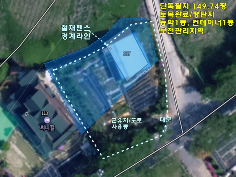 간략설명 | 남서향으로 북서향으로 트인 조망 나옴, 보전관리지역 토목완료, 농막1동, 컨테이너1동 연결해서 사용중 (TV, 에어컨, 냉장고 등 내부집기 일체 포함해서 매매함) 현재 밭으로 사용중(대추/사과/살구/복숭아등 유실수) 개별 지하수, 정화조, 경계는 철재 펜스+대문 설치,6m 왕복2차선, 아스콘 포장, 공도 지방도에 접하고 주변이 전원마을과 펜션들로 이루어짐,버스 정류장 약 150m 거리 서종면사무소 및 생활권 약 15km거리,두물머리IC 약 7km거리 |