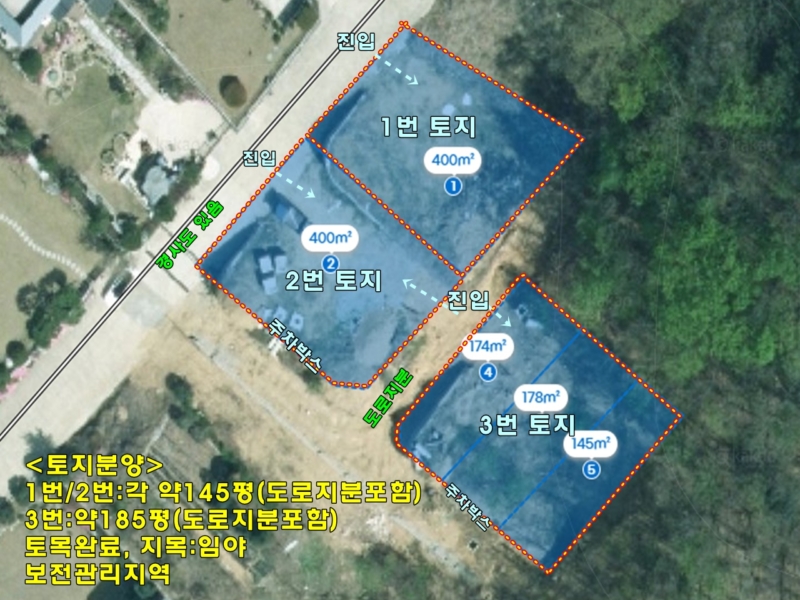 | 간략설명 | 남서향으로 탁트인 조망(지대가 놓음),보전관리지역,토목완료, 평탄지 필지 앞 진입 도로 경사도 있음 3개의 택지로 토목이 완료된 상태이며, 2번,3번 토지는 지하 주차박스 있으며 1번,2번 토지는 도로에서 바로 진입가능하며 도로 경사도 있음 소규모 전원단지 내 상단에 위치, 버스정류장 및 지방도 약 600m거리 양수역 및 생활권 약4km거리 |