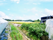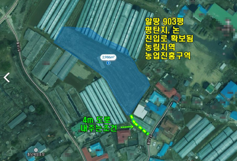 주변 비닐하우스 농지에 둘러쌓인 토지 ,정면 아래필지보다 해당토지 지대가 높음​