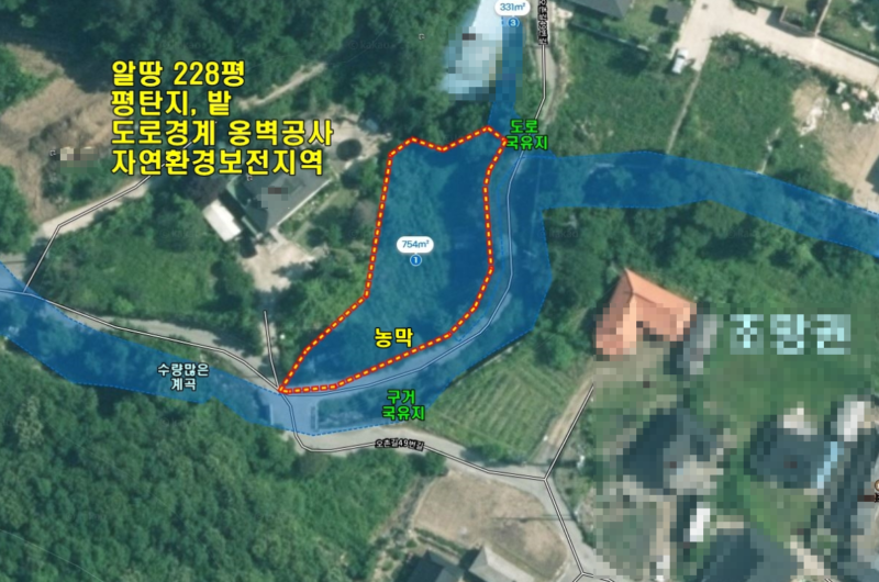 | 간략설명 | 전체적으로 동향이며 정면 평탄지 전망 나옴,자연보전지역, 평탄지, 밭으로 사용중 작은 농막창고 있음 (휀스 설치됨),도로접한 경계부분 옹벽 공사되어 있음.접한 도로보다 지대가 높음 4m포장도로, 도로+구거 국유지, 현황도로,원주민마을 안쪽에 있으며 앞쪽에 구거 인접해 있음 지방도 인근 마을입구에 용문천이 흐르고 있음,2차선 도로 및 버스정류장 약 700m 거리 용문산 관광지 약 1.6km,용문면사무소 & 생활권 약 8.1km