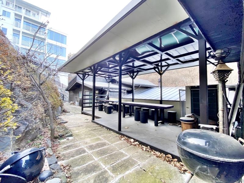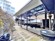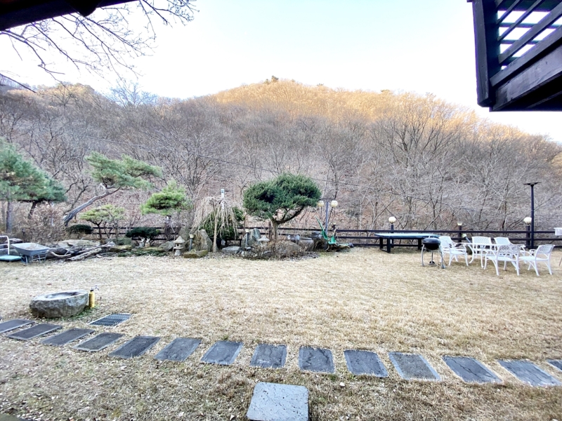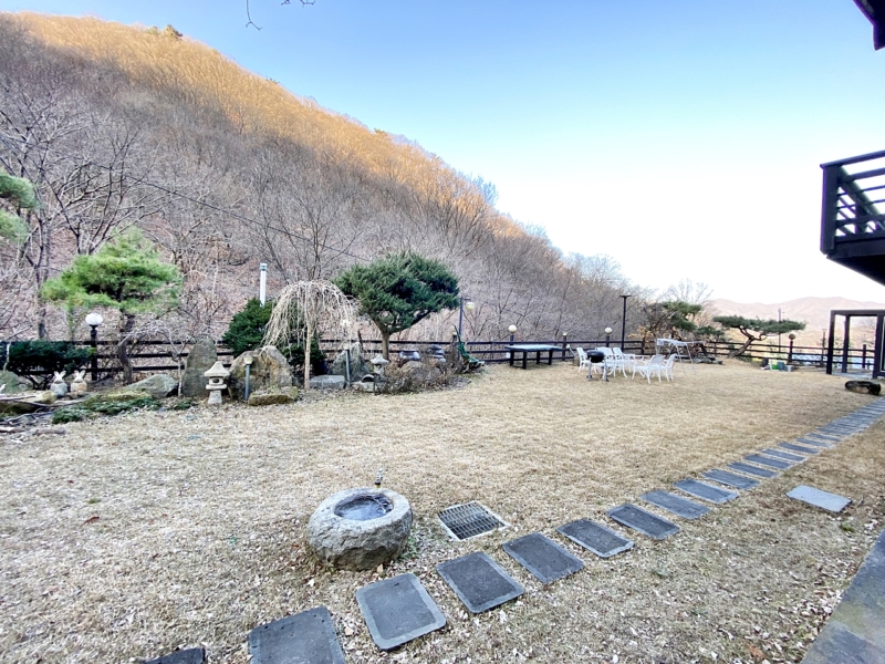 2층에 바베큐, - 잔디마당, 디딤석, 정원수, 조경석, 석재조형물,미니 연못, 철재 펜스 및 대문