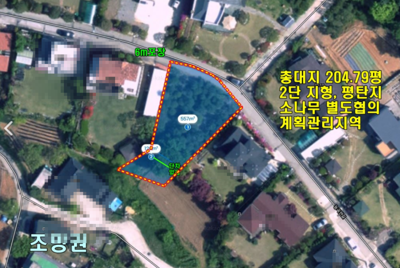 | 간략설명 | 계획관리지역, 2단 지형 평탄지,현재 소나무 심어져 있으며 매수자가 원할 경우 별도협의가능 원치 않으면 다른 곳으로 옮겨 심을 예정이라고 함, 접한도로와 지대높이가 비슷함. 상하수도 연결가능한 단지,단지내 6m 포장도로, 필지일부 도로부지로 사용중 외지인 위주로 형성된 소규모 전원주택단지,2차선도로 및 버스정류장 420M 거리 두물머리 IC 톨게이트 3.1KM,서종면사무소 및 서종면시내 생활권 약 7.1km 거리 |
