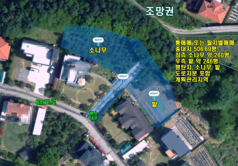 | 간략설명 | 전체적으로 남서향이며 남서향쪽은 평탄지 전망으로 특별한 전망은 없고,뒤쪽 북~북동향으로 전망 나옴 계획관리지역, 평탄지 밭으로 사용중,북쪽으로 경계일부 급경사지 단차 있음 현재 밭은 앞주택 주민이 사용중임,현재 소나무 심어져 있으며 매수자가 원할 경우 매매 의사 있음, 원치 않으면 다른 곳으로 옮겨 심을 예정이라고 함,단지내 6M 포장도로 - >4m~5m포장도로, 사도, 도로지분 있음 도로 지분 120평은 매도인이 단독 소유하고 있으며, 인근 토지 매매 시에는 매각 면적 대비 약 12~13% 수준의 도로 지분만 함께 매매한다고 함 외지인 위주로 형성된 소규모 전원주택단지, 2차선도로 및 버스정류장 420M 거리 두물머리 IC 톨게이트 3.1KM,서종면사무소 및 서종면시내 생활권 약 7.1km 거리 |
