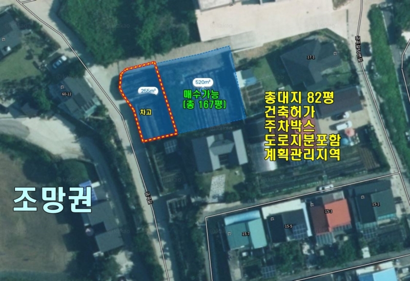 남향, 임255㎡(77.14평), 도로지분16.1㎡(4.87평), 오수관로, 상수도 등 기반 시설 인입, 주차박스 9평