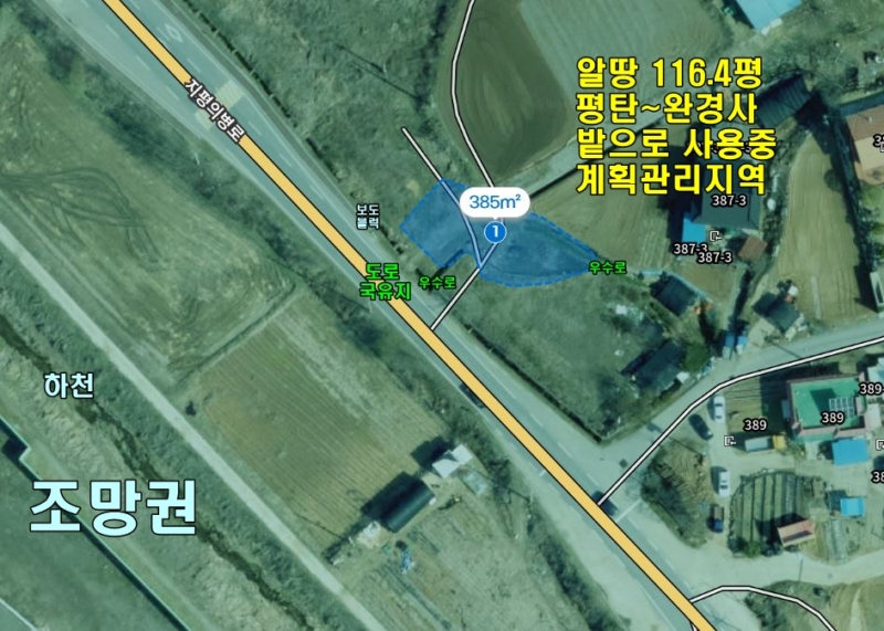 | 간략설명 | 남서향, 답385㎡(116.46평), 평탄지/밭으로 사용중, 버스 130m, 편의시설 / 지평역 3km, 석불역 200m |