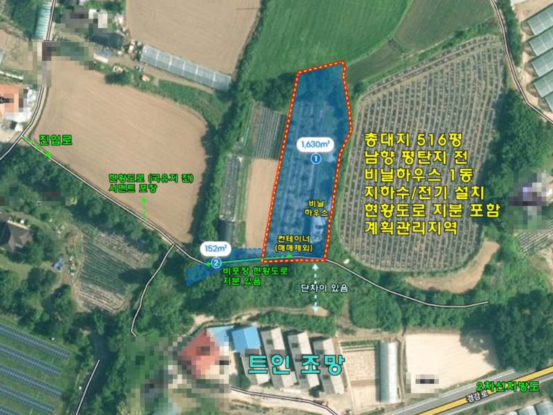 부속건물인 비닐하우스 1동 매수인 희망 시 사용 가능,컨테이너 1동은 소유자가 수거예정으로 매매 제외