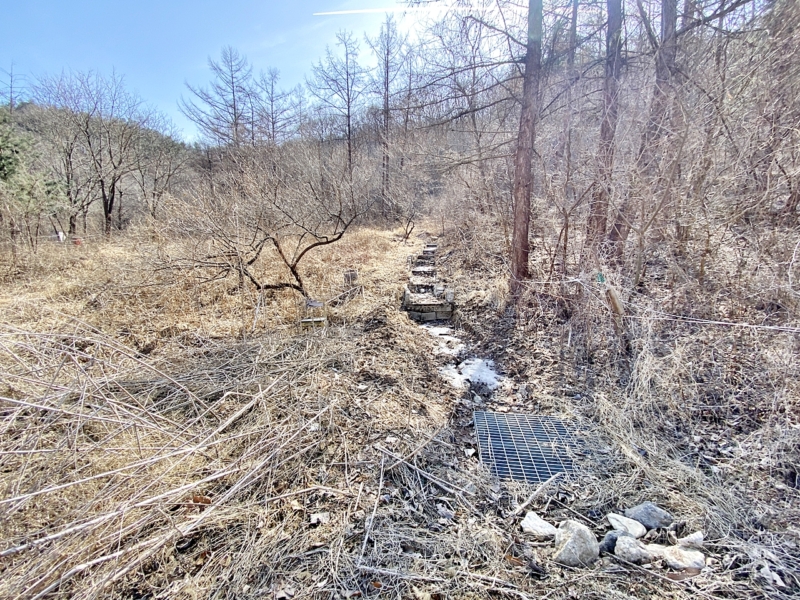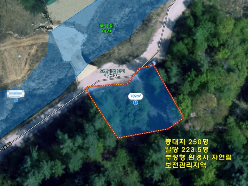 | 간략설명 | 북향으로 도로와 하천이 있어 답답하지 않음,전체적으로 산으로 둘러싸인 필지임,보전관리지역 부정형 완경사 자연림,필지 경계로 줄 둘러져 있음,개복숭아 나무 심어져 있으며, 필지 옆쪽으로 계단식으로 개울 흐르게 만들어두셨다고 함,8M 포장도로, 법인 명의로 지분없이 이용중 |