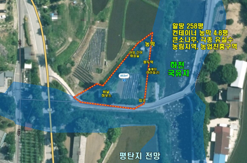| 간략설명 | 농림지역, 농업진흥구역,2021년 준공, 컨테이너 농막 16㎡ (4.84평) 별도 비닐하우스 1동, 원두막 1동,개별 지하수, 농업용 및 농막용 전기 완비 작년 감자, 고추, 옥수수 등 농사지고 계심,유실수(5~6종), 경계선쪽으로 큰소나무 약 13그루 하천쪽 계곡을 이용할수있게 돌계단이 설치되어 잇음, 휀스 대문 설치 있음 4m 포장도로, 하천부지 현황도로 , 산음보건소 인근에 자리잡은 주말농장 지방도 2차선도로 50m 거리,버스정류장 약 100m 거리, 단월면사무소 및 단월시내생활권 약 11.1km 거리 |