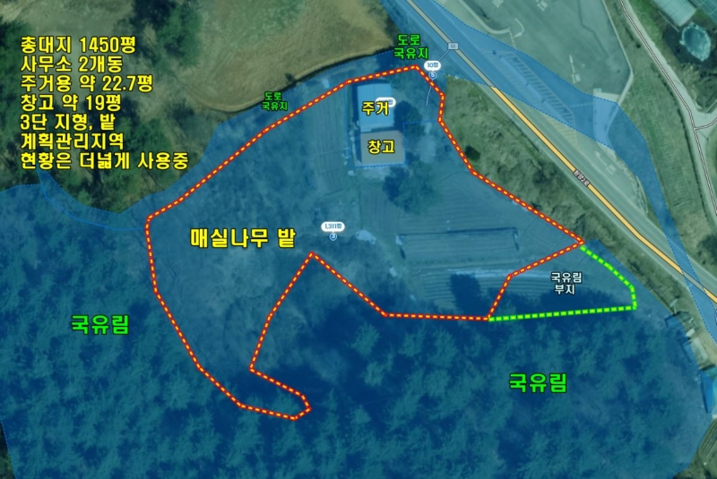 | 간략설명 | 건축물은 동향이며 전망은 북동~남동향으로 나옴,1997년 준공, 경량철골조, 사무소 2개동 1997년 농가주택 과 창고로 준공냈다가 2004년도에 사무소로 용도변경함. 주1 사무소 22.69평 (현황 주거용으로 실거주) / 방2개, 거실, 주방 욕실1개 부1 사무소 19.06평 (현황 창고로 사용중) 마을상수도, 정화조, 전기판넬 바닥난방 주거용 주택 기존 기름보일러 고장난서 전기판넬로 교체시공하셨다고함 전체적으로 3단 지형, 소유주 직접 농사 중 ( 매실나무, 고추, 양파 등) 지방도 2차선도로 접해있는 근생부지,버스정류장 약 80m 거리,기차 양동역 및 양동시내생활권 약 3.3km 거리 |