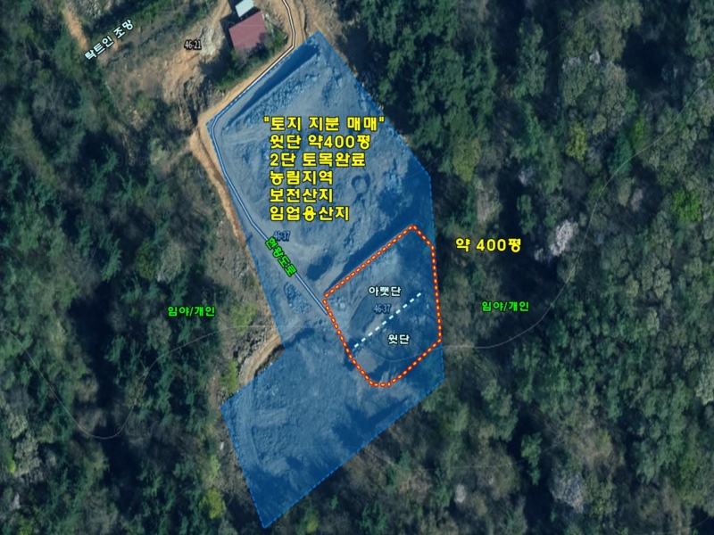 | 간략설명 | 북서향으로 상단에 위치해 탁트인 조망 나옴,농림지역, 보전산지, 임업용산지 현재 4단으로 토목이 되어 있으나 그 중 윗단 매매 진행,평탄지, 2단 토목이 되어 있으며, 평수는 약 400평정도 된다고 함 필지 안에 지하수 관정 有, 도로에 전주 有-->현재는 연결되어 있지 않음,필지 안에 기둥과 지붕 구조만 남아있는 구조물이 2개 있음 현황도로에 우수관 有,약 4m 비포장도로, 현황도로(개발 진행중 면적 확인필요) 전원 마을 상단에 위치한 개발 중인 토지,버스 정류장 약 1km 거리,두물머리IC 8km 거리 서종면사무소 및 생활권 약 12km거리 |