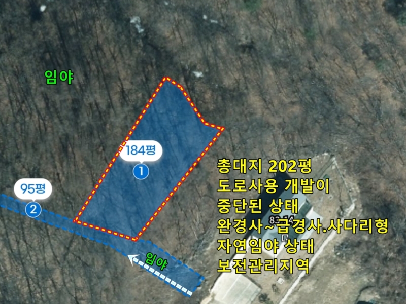 남동향으로 마을과 멀리 산을 바라보는 전망,보전관리지역 / 급경사.사다리형,자연임야 상태임