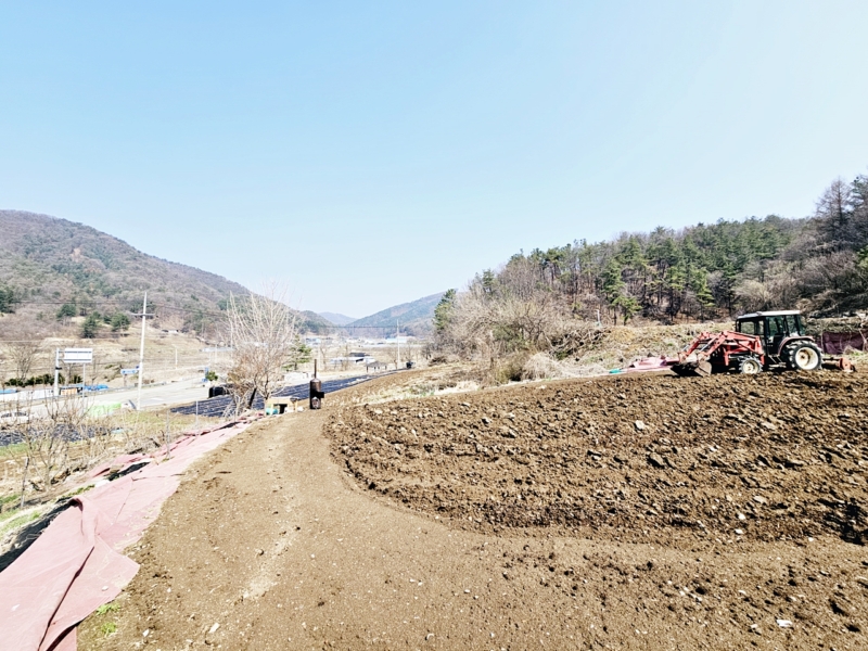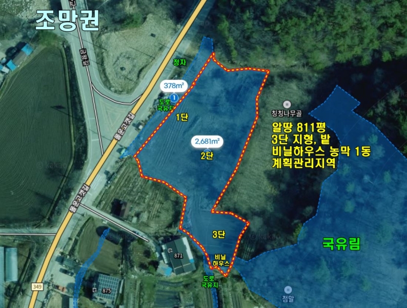 계획관리지역, 평탄~완경사지,3단 지형의 밭, 비닐하우스형 농막 1동 있음