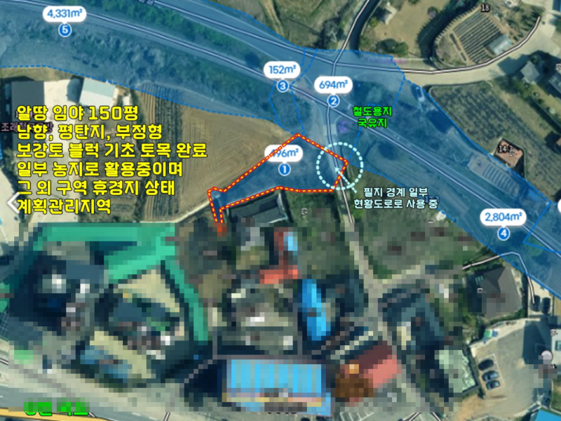 | 간략설명 | 계획관리지역, 부정형 평탄지,도로보다 높은 위치에 자리 잡고 있으며, 도로와의 경계면에는 보강토 블록으로 기초 토목 되어 있음,필지 경계 일부 현황도로로 사용 중 토지의 일부는 검은색 비닐 멀칭 작업이 완료된 상태로,현재 농지로 활용되고 있는 상태 무상 경작지 문제 없다고 함 (매도인이 정리 후 매도 조건),멀칭이 되지 않은 구역은 마른 풀과 잡목이 자라 있는 휴경지 상태 토지 주변으로 잎이 나기 시작한 활엽수와 침엽수들이 배치되어 있음, 소유자의 남편분이 말씀하시길 자신이 풍수지리 전문가이며, 하기 내용은 매물설명에 꼭 기재해 달라고 요청 하심,본 토지는 풍수지리적으로 명당, 재물복이 따르고 발복 350년 (발복: 땅에서 나오는 기운), 인접한 맹지(소유자 서울 거주) 필요 시 매수가 가능하다고 함 4m 아스팔트 포장도로, 현황도로 (국유지 철도용지 + 사유지),소유자 토지 일부 현황도로 물려있음 남산에서 뻗어 나온 능선 자락에 위치 ,마을 남쪽으로 남한강이 흐르고 있으며, 인근에 양평 들꽃수목원과 양강섬 등 수변 공원이 조성되어 있음,버스정류장 및 6번 국도 200m 거리에 위치 |