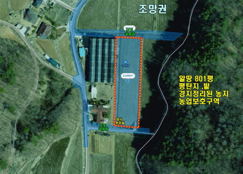 | 간략설명 | 평탄지이며 남향 또는 동향이 적합해보이며,조망권은 북향으로 나옴, 농림지역, 농업보호구역 평탄지, 밭으로 경작중,농수로에서 수도 배관을 끌어와서 물을 사용중이라고함. 필지내 임시로 이동식 야외화장실 설치되어 있음,접한 도로보다 지대가 낮음 3m 포장도로, 도로 국유지,망미2리 석불역 뒤쪽으로 자리잡은 경지정리된 농지 지방도 2차선도로 980m, 버스정류장 1.2km, 석불역 1.3km,지평면사무소 및 지평시내 3.5km, 지하철 지평역 4.3km |