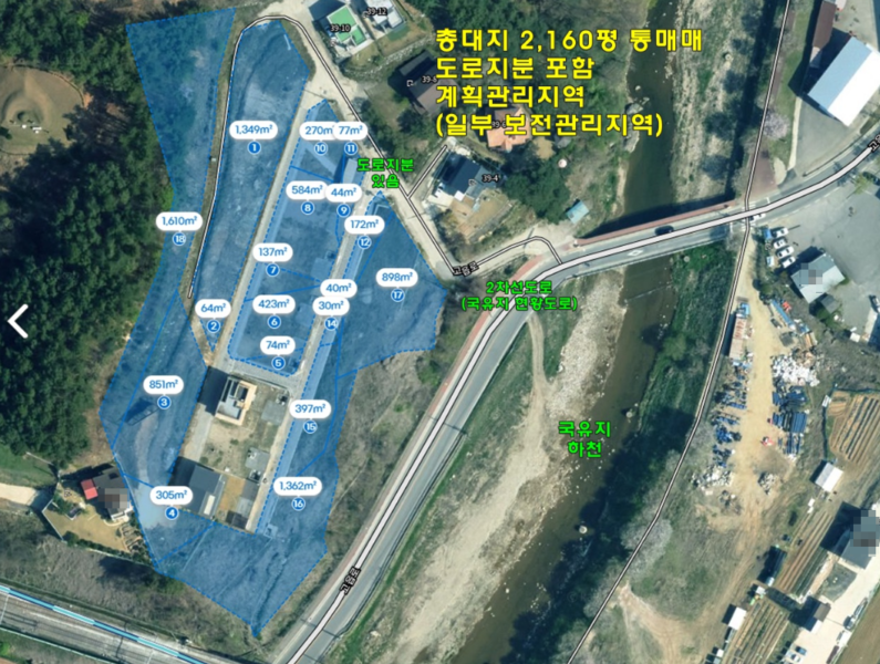 | 간략설명 | 계획관리지역 (일부 보전관리),전체 약 30택지 면적의 주택 단지이며, 현재 일부 3단으로 토목 및 도로 공사되어 있음,30개 택지 중 건축허가 20개 받아 주택은 2채만 지으셨으며, 남아있는 건축허가 18개에 해당되는 택지면적 만큼만 매도하신다고 함 (도로포함 120평씩 18개 = 2,160평) 상수도/오수관로/도시가스 인입 단지 ,일부 전기/통신 지중화, 자동문 설치된 주차박스 있음 2차선도로 100m, 버스정류장 380m, 6번국도 550m 거리 아신역 850m, 양평 TG 1.8km, 옥천면사무소 930m 거리 |