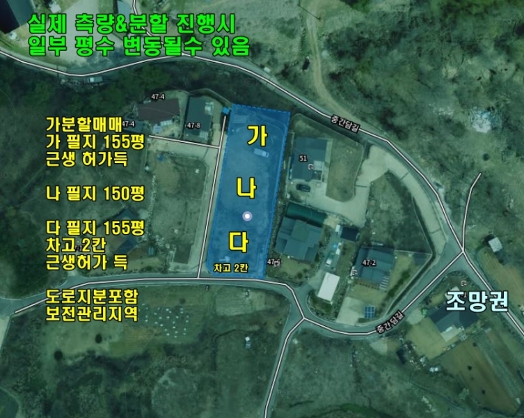 | 간략설명 | 정남향이며 전망는 북동~동~남동으로 나옴,보전관리지역, 가분할도 맞춰서 분할매매 첨부한 가분할도 및 분양가표 참고하세요!,보강토 및 일부 옹벽 토목공사완료 가" 필지 : 분양 155평 / 알땅 120평 / 도로지분 35평, 근생허가 득한상태 ( 현장답사후 실제 뒤쪽 토목경계가 필지경계와 다르다고 안내드렸더니 실측해서 평수맞춰서 평당가 맞추겠다고 하심)나" 필지 : 분양 150평 / 알땅 116평 / 도로지분 34평 다" 필지 : 분양 155평 / 알땅 120평 / 도로지분 35평 ,주차박스 2칸으로 옹벽공사되어 있음 근생허가 득한상태,4m 마을포장도로 -> 필지내 5m 시멘트포장도로, 도로지분보유 지방도 2차선도로 570m 거리,버스정류장 약 830m 거리 지평면사무소 약 5.2km 거리,지평역약 5.7km 거리 |