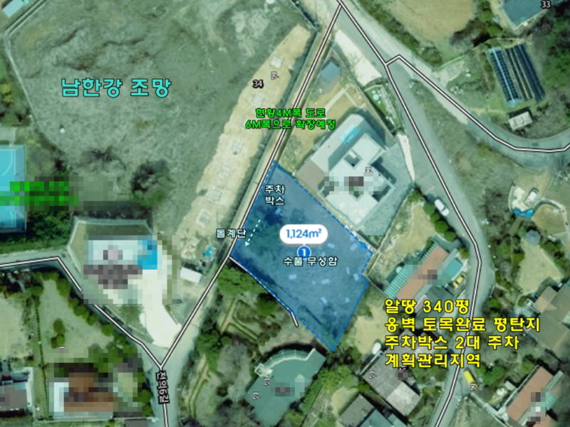 | 간략설명 | 전체적으로 북동향이며 정면 강조망 나옴,계획관리지역, 평탄지,옹벽 토목공사완료된 토지 주차박스 차고 2대 공간 있음,예전에 주택허가 냈다가 취소된 사례있음 지적상 6m폭 도로 > 현황 4m 포장도로 ,도로지분없이 도로사용가능한 조건으로 매수한 토지라고 하심 추후 6m 도로폭으로 확보될 예정 이라고 하심. ,전수리 "블룸비스타 호텔앤컨퍼런스" 인근 택지 남한강 및 지방도 인근에 자리잡은 외지인 위주로 형성된 고급 전원주택마을 지방도 400m 거리, 버스정류장 500m 거리,강하면 체육공원 및 강하면사무소 약 1.7km 거리 |