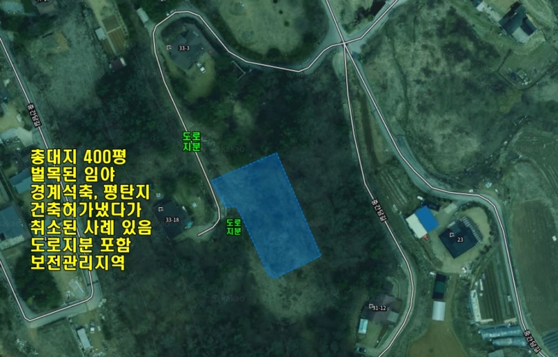 | 간략설명 | 평탄지 남동향이며,2층 건축시 전망은 북동~동~남동으로 나옴, 보전관리지역, 평탄지 현황상 벌목된 임야,접한 도로와 단차가 있음, 경계석축공사하고 평탄화 되어 있음 예전에 건축허가 냈다가 취소된사례있다고함.,4m포장도로, 사도, 도로지분 보유 지방도 2차선도로 570m 거리,버스정류장 약 830m 거리,지평면사무소 약 5.2km 거리 지평역약 5.7km 거리 |