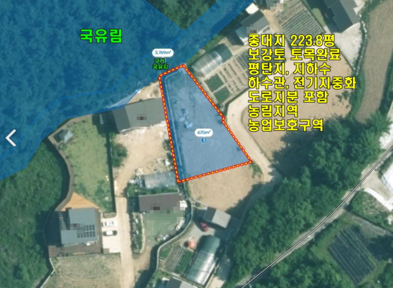 | 간략설명 | 정남향으로 평탄지 전망,농림지역, 농업보호구역,보강토 기본 토목공사 완료 지하수 인입, 하수관 인입, 전기 지중화 매설,결계 철재휀스 설치되어 있음 뒤쪽 구거 접해있으며, 내려가서 사용할수있게 돌계단 있음 4m 포장도로, 도로지분 보유,26년 3월말 안으로 도로준공예정 부안리 저수지 인근에 자리잡은 토지,토지 뒤쪽으로 구거 접해 있음 2차선도로 약 750m 거리,버스정류장 약 850m 거리 단월면사무소 및 생활권 약 4.1km 거리 |