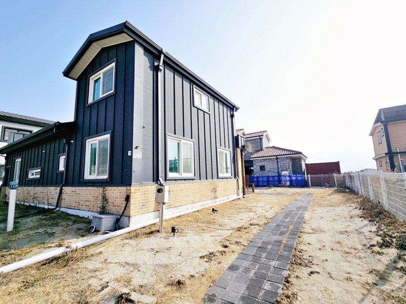 ​황토, 편백나무, 바닥: 강화마루, 이중창, 1층 방 2개, 거실, 주방, 화장실 2개, 2층 다락 공간, 테라스