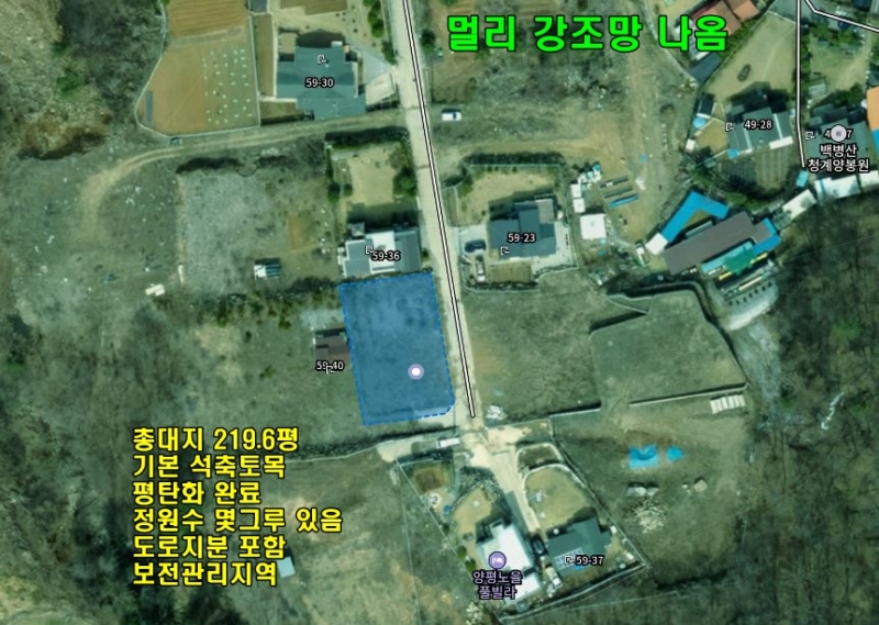 | 간략설명 | 북향, 임660㎡(199.65평), 도로지분66㎡(19.97평), 지하수, 2차선도로 및 버스1.4km, 양평역 7.2km |
