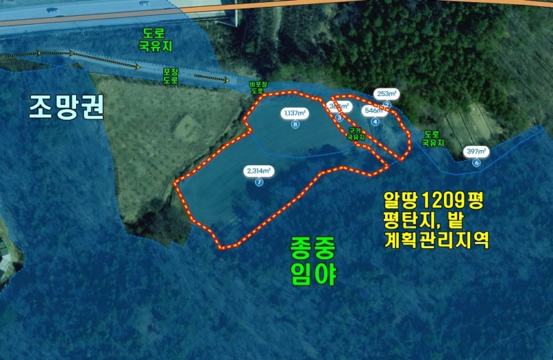서향~북서향으로 트인 전망 있음,계획관리지역, 2단 지형의 완경사