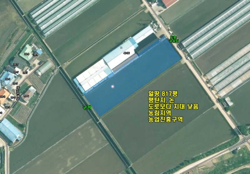 | 간략설명 | 평탄지 남동향이며 정면 농지로 트인 전망.농림지역, 농업진흥구역.평탄지, 경지정리된 논 접한도로보다 지대가 낮음,필지 양쪽으로 구거 우수로 접해 있음,4m 시멘트포장도로, 도로국유지 농로 접해 있음 청운면 초입 6번 국도 인근에 위치한 농림지역 농지,"느타리 버섯" 공장 접해 있음 6번국도 4차선 도로 및 버스정류장 850m거리, 청운면사무소 및 청운시내생활권 약 3.1km 거리 |