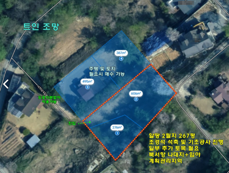 | 간략설명 | 계획관리지역,조경석 석축 및 기초토목공사 진행된 대+임,필지내 북서쪽 비포장 도로라인은 평탄화 완료이며, 그 외 필지는 벌목된 완경사로 추가 토목 필요함,4M~5M 포장도로, 사도 소유자분 바로 앞 필지 주택 건축하셨으며,단지 내 도로 도로지분 없이 이용가능하다고 함 필요시 단지 내 도로지분 매수는 가능하다고 하셨음,서후2리 안쪽 위치한 외지인 중심의 주택단지 내 토지 2차선도로 1.1km, 버스정류장 1.2km 거리, 두물머리 TG 7.6km, 서종 TG 15km 거리,서종면 생활권 12km 거리 |